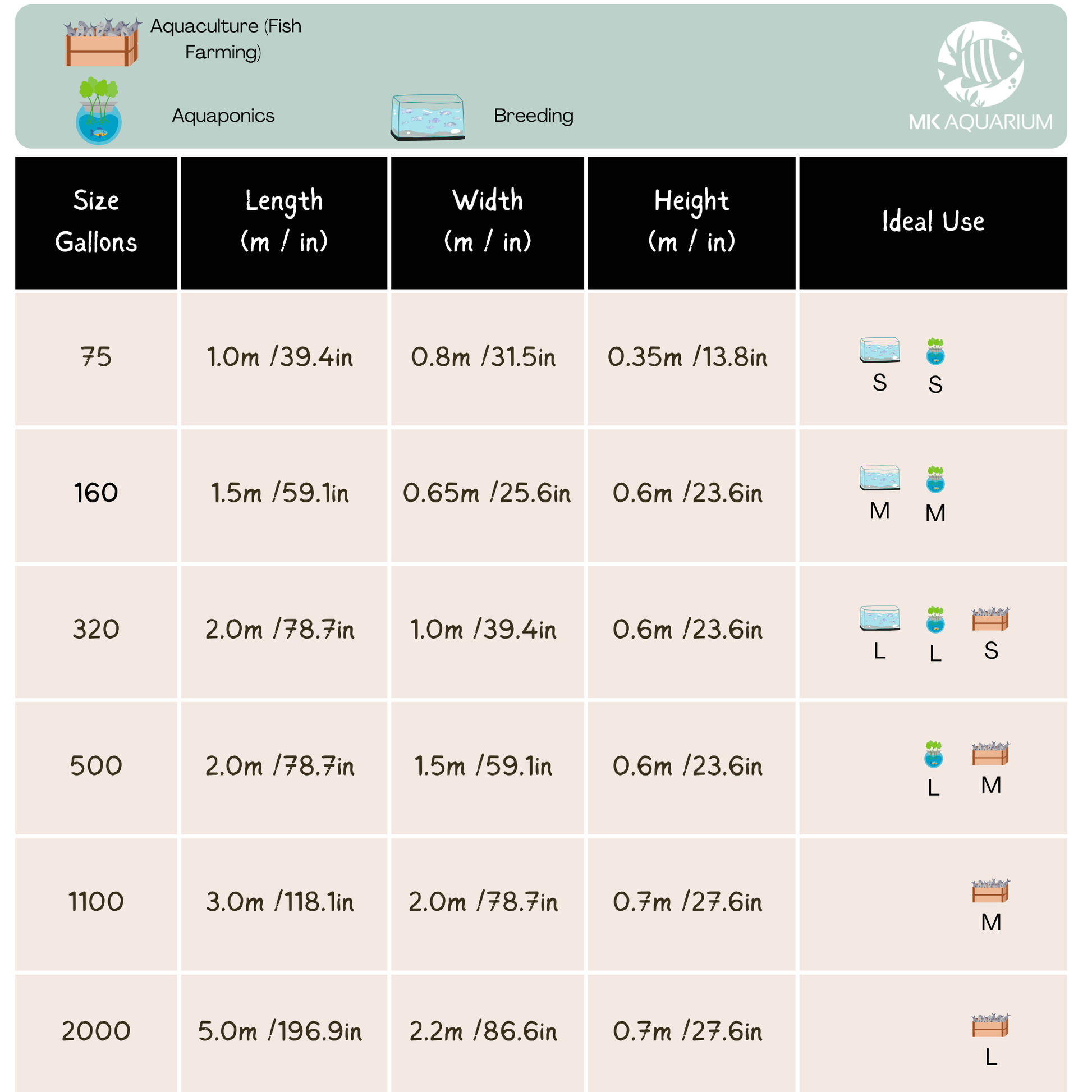 • Use our size chart to determine the best tank for your desired fish yield.