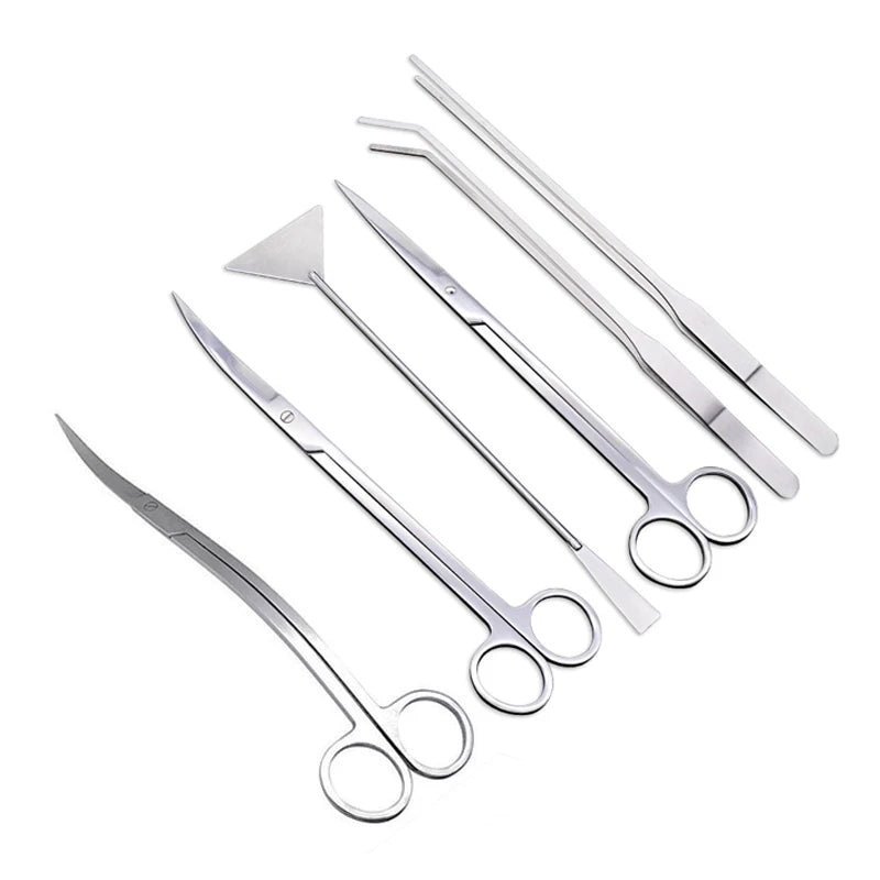 You get straight scissors, curved scissors, wave trimmers, tweezers, and a substrate shovel, plus a storage pouch.